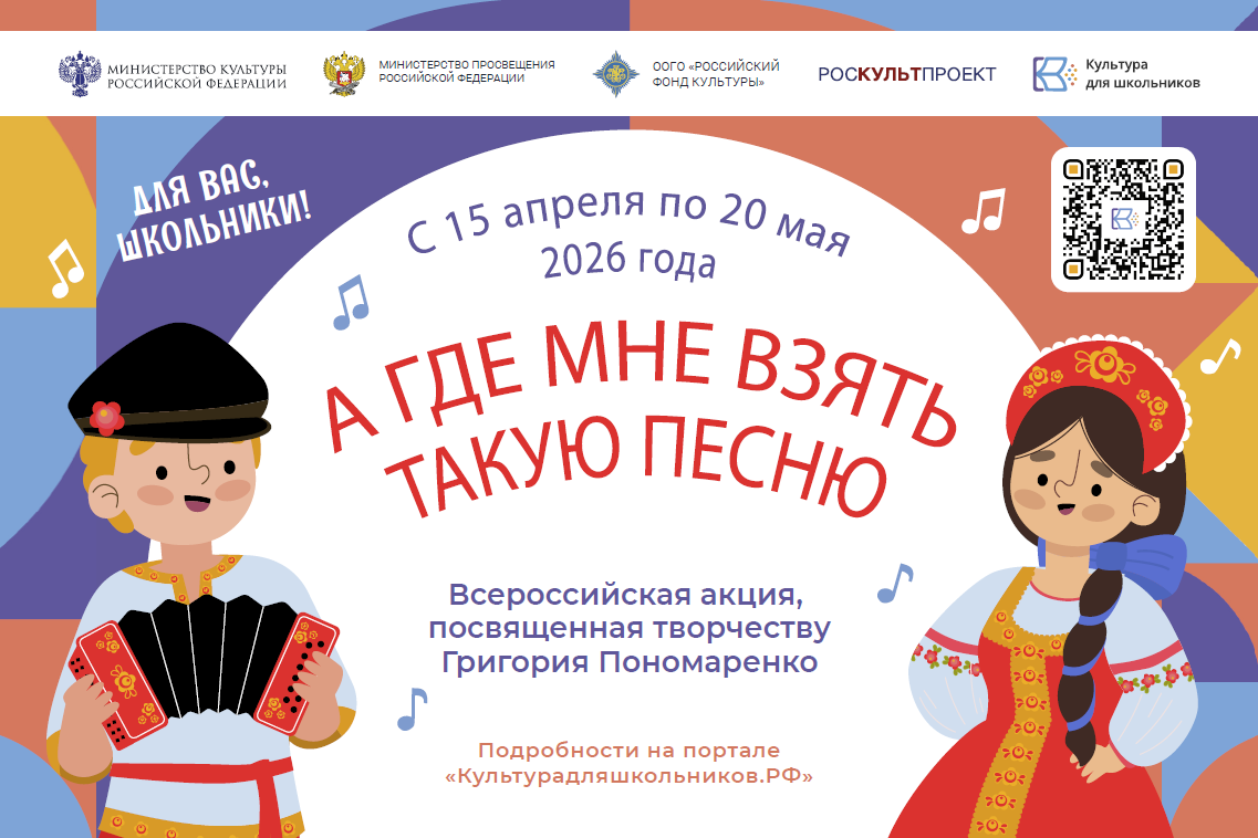 С 15 апреля по 20 мая 2026 года в рамках межведомственного культурно-образовательного проекта «Культура для школьников» пройдет всероссийская акция «А где мне взять такую песню», посвященная творчеству Народного артиста СССР, композитора Григория Пономаренко.